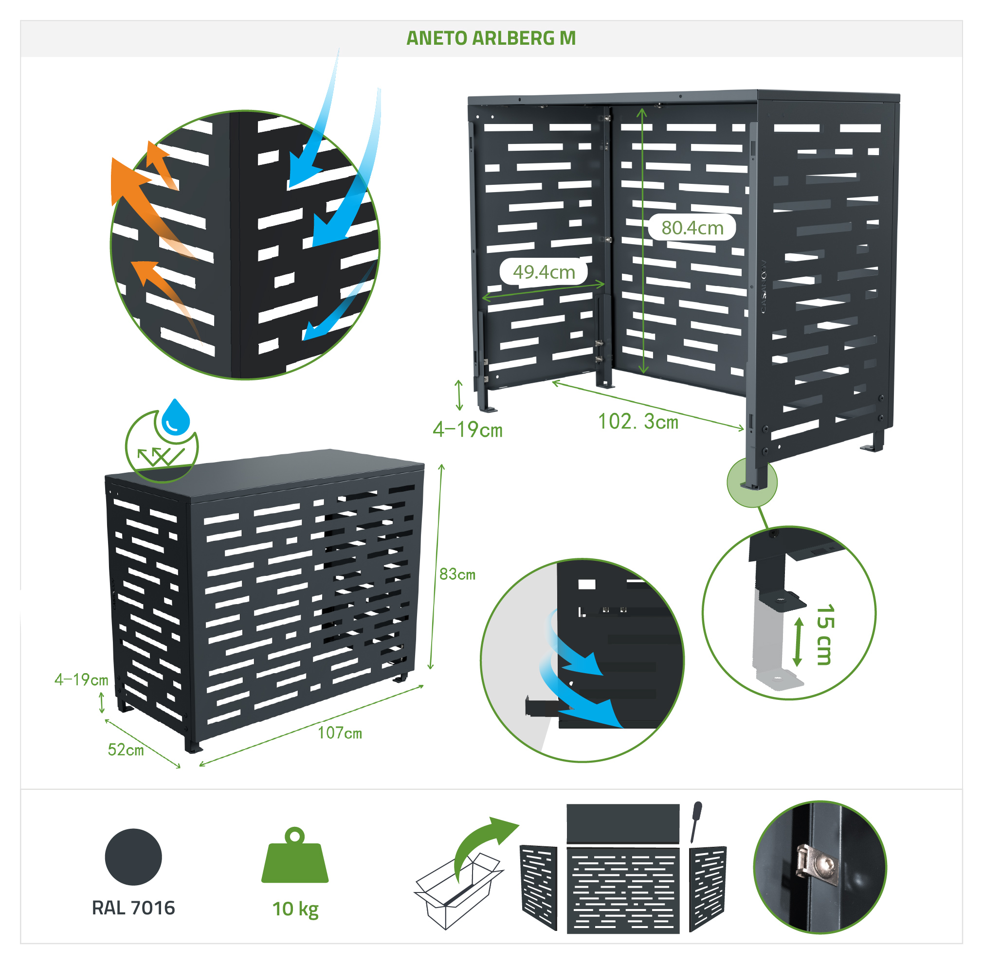 The Aneto Arlberg aluminum air conditioner cover impresses with its clean design and openwork graphic lines that bring a contemporary touch to your exterior. Its aluminum structure ensures lightness and optimal resistance to the elements, while also facilitating installation and maintenance. Both functional and aesthetically pleasing, this air conditioner/heat pump cover discreetly conceals your unit for a harmonious and polished look. A modern decorative accessory, this aluminum cover is designed to enhance your facades while effectively protecting your equipment.