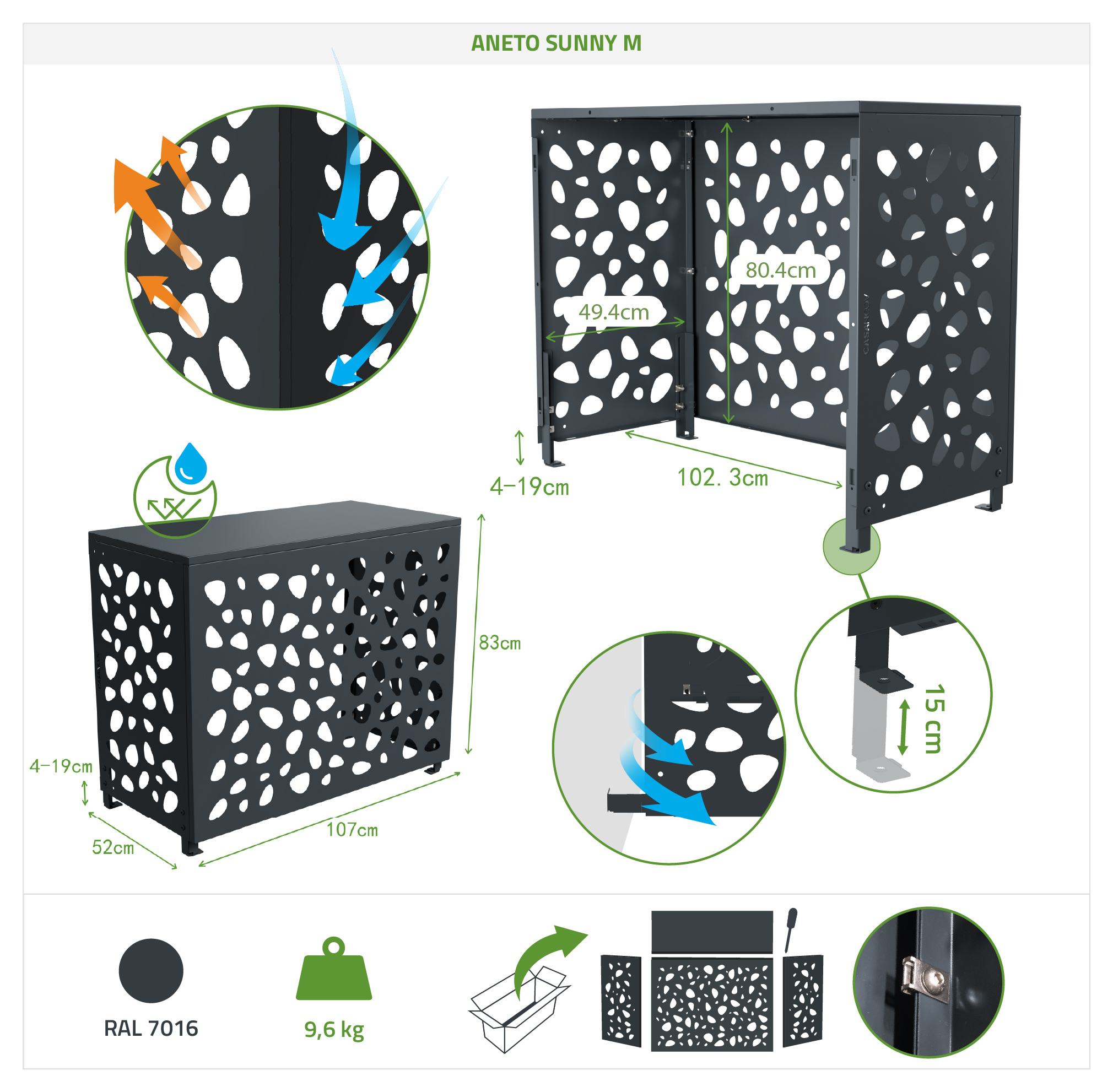 With its contemporary pebble pattern, the Aneto Sunny aluminum air conditioner cover adds a touch of refined style to your exterior. Its aluminum construction makes it lightweight while ensuring excellent durability. Perfect for protecting your air conditioning unit while maintaining the visual harmony of your facade. Its openwork design allows air to circulate while elegantly concealing your technical equipment. A modern, aesthetically pleasing, and practical air conditioner/heat pump cover, designed to enhance your outdoor space without compromising on quality.