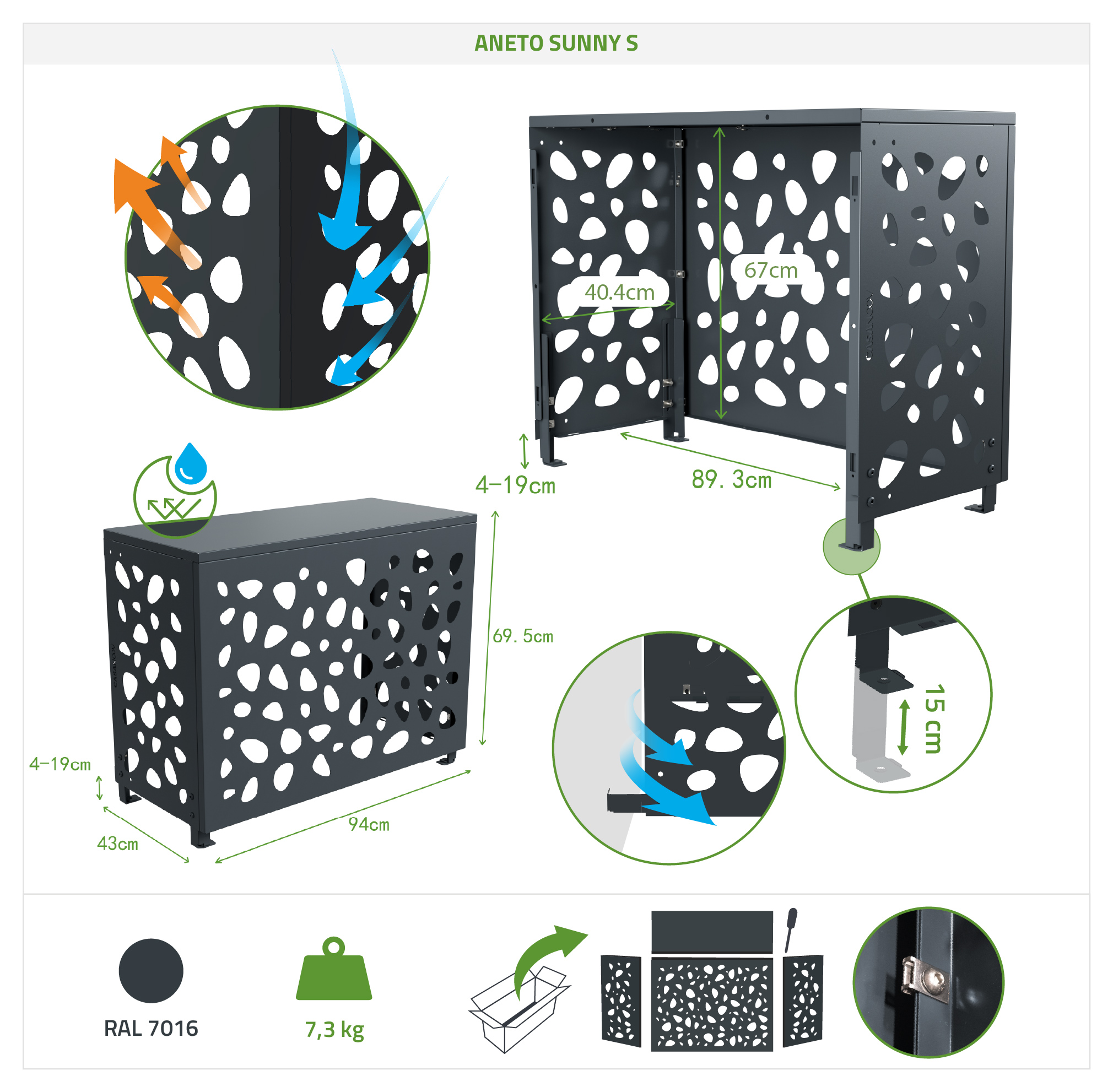 With its contemporary pebble pattern, the Aneto Sunny aluminum air conditioner cover adds a touch of refined style to your exterior. Its aluminum construction makes it lightweight while ensuring excellent durability. Perfect for protecting your air conditioning unit while maintaining the visual harmony of your facade. Its openwork design allows air to circulate while elegantly concealing your technical equipment. A modern, aesthetically pleasing, and practical air conditioner/heat pump cover, designed to enhance your outdoor space without compromising on quality.