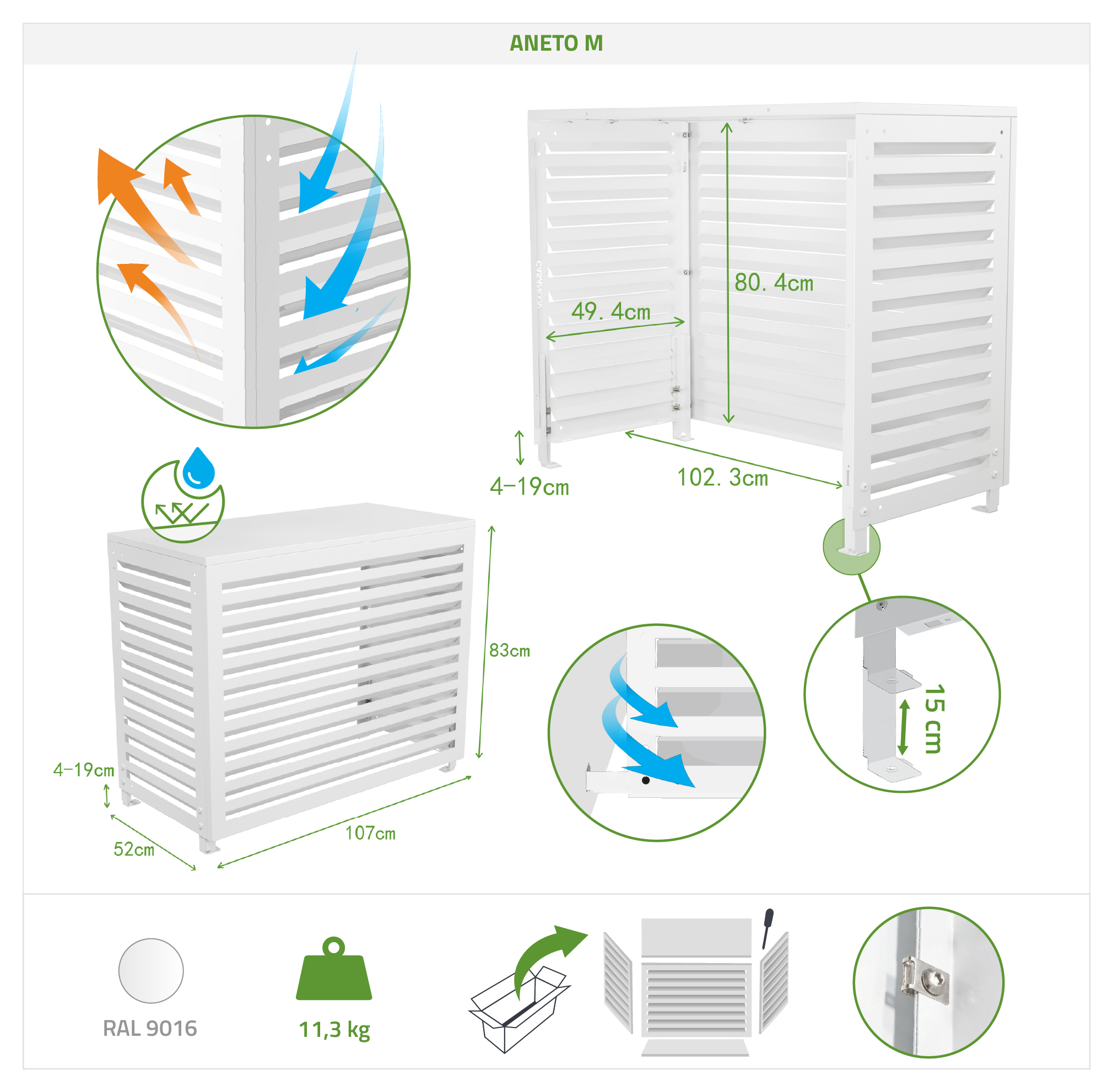 The Aneto aluminum air conditioner cover impresses with its louvered design, offering a discreet and elegant charm. Its aluminum construction provides a refined finish, remarkable lightness, and excellent weather resistance, ideal for long-lasting outdoor use. Thanks to its perforated slats, this air conditioner/heat pump cover allows for good ventilation of the unit while discreetly concealing it. A model with a simple and timeless style, perfect for blending harmoniously with all types of outdoor spaces. The slats of this air conditioner cover are reversible; they can be installed facing up or down to best suit the positioning of your air conditioner or heat pump.